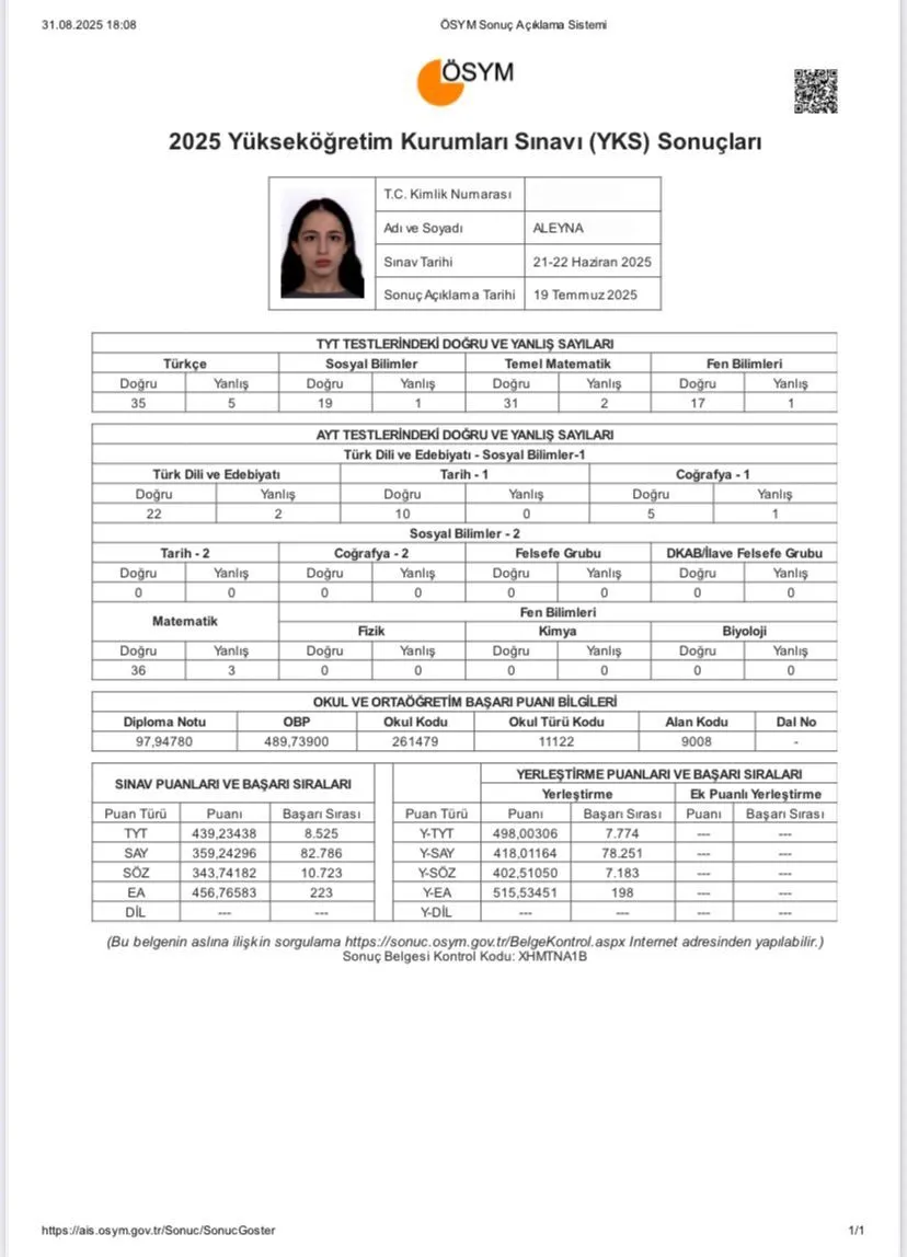 merhaba, ben Aleyna. 2025 YKS’de eşit ağırlık alanında 198. olarak Sabancı Üniverstesi Yönetim Bilimleri Fakültesine yerleştim. Kendimi bildim bileli ders çalışmaya yatkındım. Yks sürecine başlayışım ise 11. sınıfta paragraf/problem/ geometri rutini oluşturmam ile başladı. Dershaneye yazıldım ancak verim alamadığım için kısa sürede gitmeyi bıraktım. Bir deneme kulübüne yazıldım ve matematikten özel ders aldım. Ders çalışmaya yabancı olmamama rağmen süreç gerçekten zorlayıcıydı. Kendime olan inancım sürekli düşüyordu, en ufak net değişimleri benim tüm psikolojimi etkiliyordu ancak bu durumu kontrol altına almayı öğrendim. Ben stres ile nasıl başa cıkacağımı, moralimi bozmadan nasıl çalışabileceğimi bazı sıkıntıları deneyimleyerek öğrendim ve senin bu sıkıntılardan minimum seviyede etkilenmen için koçluğa başladım. Önümüzdeki süreçte gerek program hazırlamak gerek stres yönetmek gibi konularda sana yardımcı olmak için sabırsızlanıyorum. Şimdiden başarılar ve görüşmek üzere!!