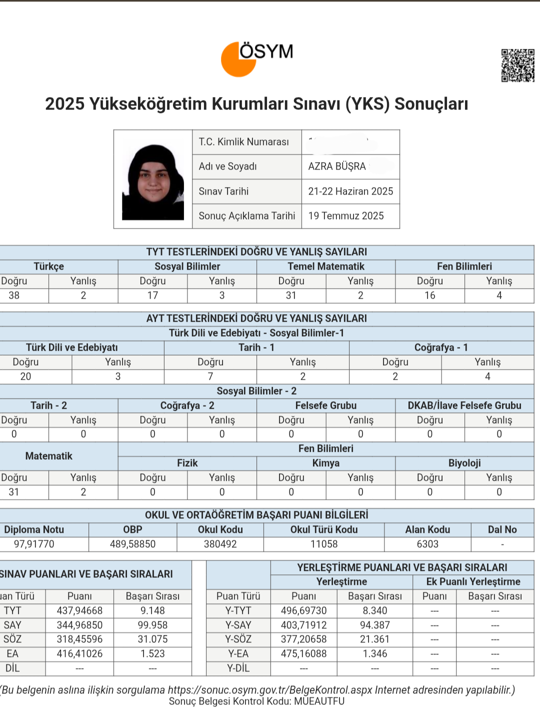 Merhaba ben Azra. 2025 Yks eşit ağırlık alanında 1346. sırayı yaparak ODTÜ Psikoloji bölümüne yerleştim. 4 sene boyunca fen lisesinde sayısal alanında çalıştım fakat mezun senesinde eşit ağırlık alanına geçtim. Ani bir kararla eşit ağırlığa gectiğim için tamamen sıfır ayt bilgisi ile başladım. Bu süreç sayesinde zaman ve stres yönetimi hakkında oldukça fazla tecrübe kazandım. Elbette inişler ve çıkışlar yaşadım fakat en önemli kısım olan sınav psikolojisini yönetebilmeyi başardım. İlerleyen süreçte senin de motivasyonunu arttırmaya, stresini azaltmaya ve verimli bir sınav yılı geçirebilmene yardım etmeyi çok isterim.