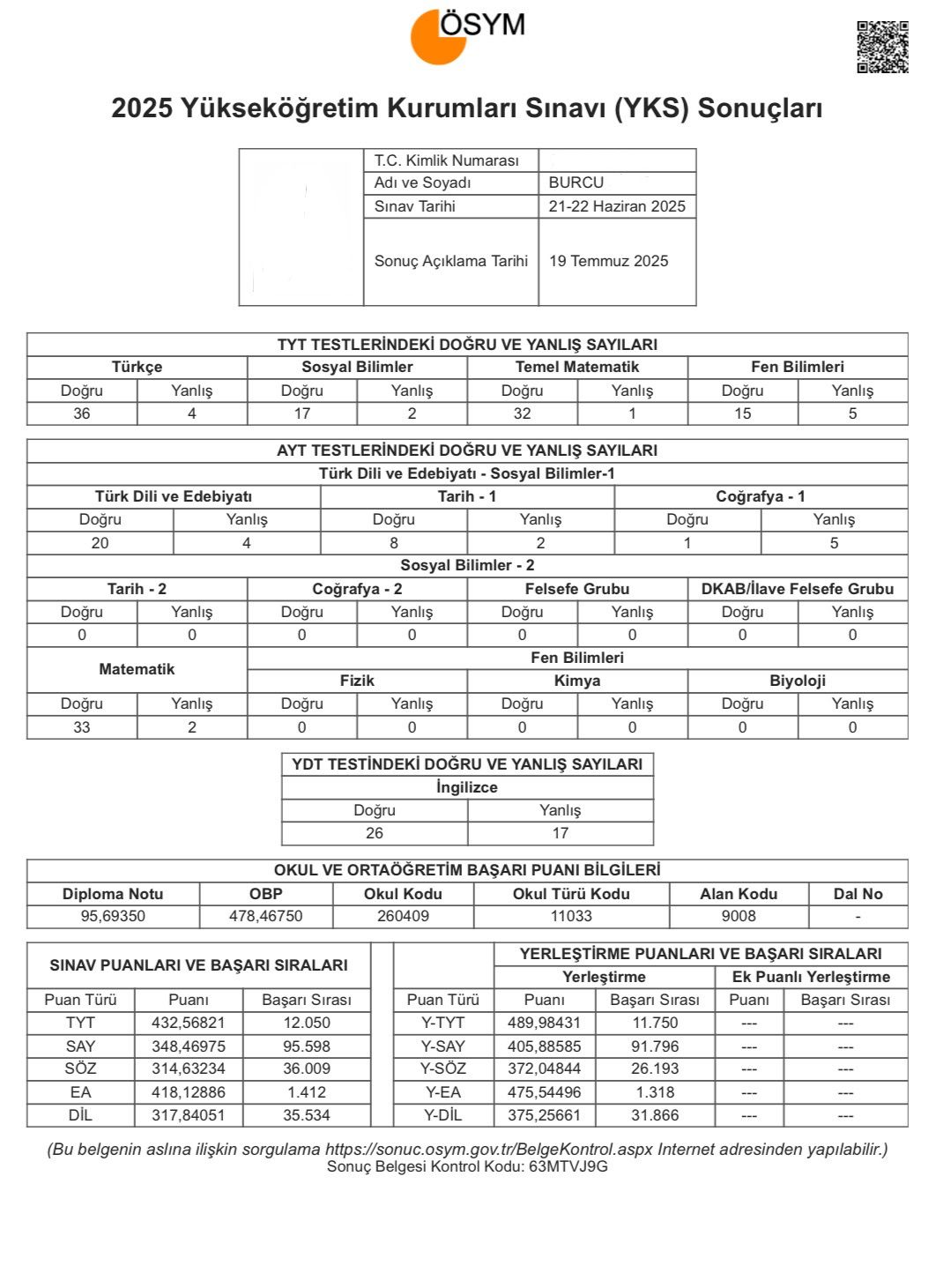 Merhabalar! Ben Burcu. 2025 YKS’de eşit ağırlık alanında 1318. oldum. Şu anda ODTÜ’de işletme öğrencisiyim. Sağlam bir temelim yoktu. Son seneme kadar lise hayatım boyunca derslerle çok ilgili değildim. Ders çalışmayı bilmiyordum. YKS serüvenim 12. sınıfta lisemin yaptığı ilk denemede 44,5 net yaparak adımı son sırada görmem ile başladı. Herkesin gerisinde kalma hissi ve yetiştirememe korkusuyla geçen bir sınav dönemi yaşadım ve bunu kendi kendime aşmayı öğrendim. Dershaneden veya kurumlardan destek almadan sadece matematikten özel ders alarak 44,5 başladığım sınav senemi 100 net ile kapattım. Yetersizlik hissine daha fazla kapılmamak için hızlı gelişmem ve çevremi bir noktada yakalamam gerekiyordu bu yüzden beni daha hızlı ileri atacak şekilde programlarımı düzenledim. Uygulamalarım beni kısa sürede geliştirdi ve bulunduğum yere gelmemi sağladı. İhtiyacım olan motivasyonu ve sürekliliği kendi kendime sağladım ve sınav sürecinin sadece akademik düzenden oluşmadığını bu sayede çok iyi anlayabiliyorum. Önümüzdeki süreçte karşılaşacağın sorunları çözmende, hedefine daha net yaklaşmanda gerek yeni yollar geliştirerek gerek mental olarak yardımcı olmayı çok isterim. Görüşürüzz!!
