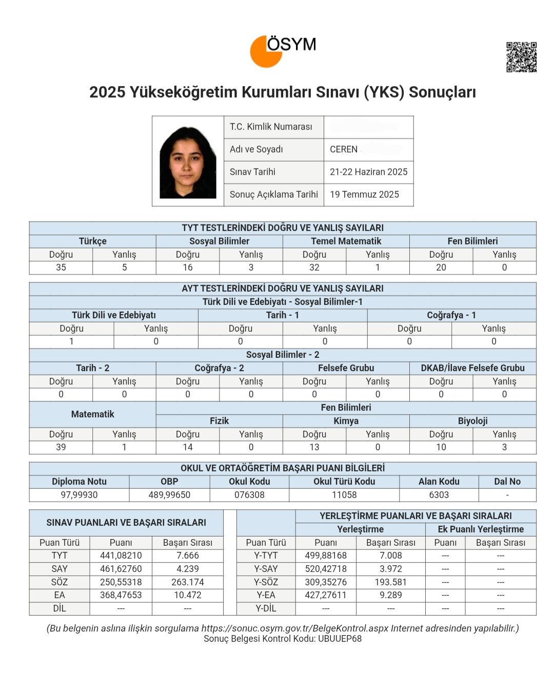 Merhaba ben Ceren. Şu an Ege Tıp 1. sınıf öğrencisiyim. Yks 2025'te sınava girdiğim ilk sene tyt alanında 7008 ve sayısal alanda 3972. oldum ve bu sınav sürecindeki deneyimlerimi, iyikilerimi, keşkelerimi başka öğrencilere de yardımcı olması amacıyla paylaşmak için coachify ailesine katıldım. 9 ve 10. sınıfta yazılılardan yazılılara çalışan bi öğrenci olarak notlarımı yüksek tutmuştum. Ama yks için bunun yeterli olmadığının farkındaydım. İlk tyt netimin de 57 gelmesi üzerine hedefime ulaşmanın ne kadar zor olduğunun farkında olsam da çalışmaktan vazgeçmedim. 11. sınıfta daha aktif çalışıp 11 yazında tamamen çalışma temposuna girmiştim. Bu sürecin kolay olmadığının çok büyük emek ve sabır gerektiğinin benim gibi sen de farkındasındır. Benim burdaki amacımsa sana en uygun programı hazırlayarak senin her gün bugün ne çalışsam gibi sorularla kafanın dağılmasını önleyip yükünü hafifletmek, senin bu süreçte kafanı bulandıran soruları elimden geldiğince yanıtlayıp sana destek olmak. Seninle tecrübelerimi paylaşıp bu sınavın üstesinden birlikte gelmek için çok heyecanlıyım. Görüşmek üzere:)