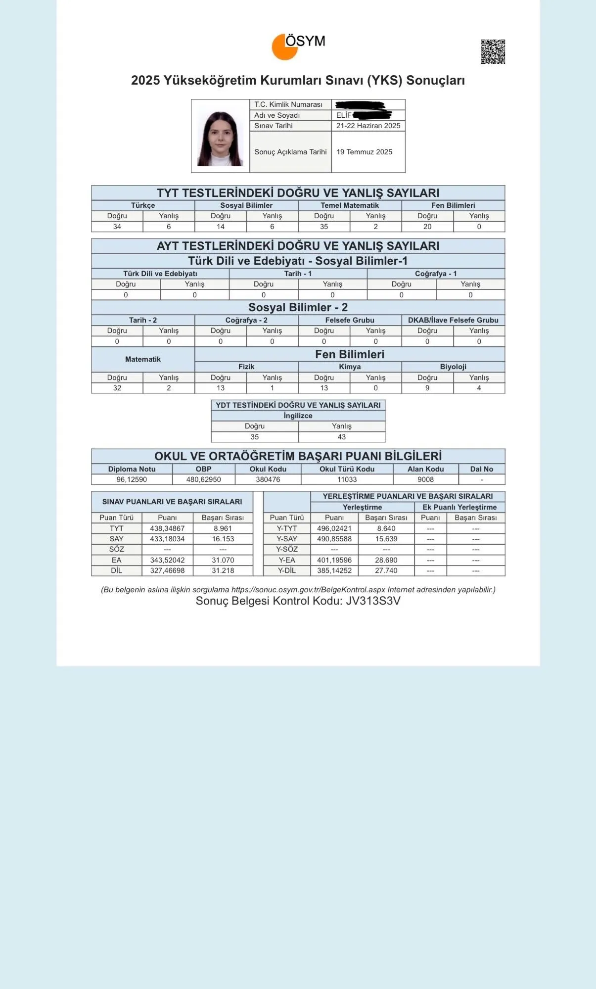 Merhaba! Ben Elif, 2025 yılında girdiğim YKS sınavında TYT’de 8.640. , Sayısal’da 15.639. oldum. Şu anda Kayseri Sağlık Bilimleri Üniversitesi Tıp Fakültesi’nde 1. sınıf öğrencisiyim. Öğrencilik hayatım boyunca derslerim iyi olarak nitelendirilebilirdi. Fakat lisede bu durum biraz değişti. 9-10. sınıfta sadece sosyalliğe zaman ayırıyordum fakat dinlediğim derslerlen dolayı konulara aşinalığım vardı. Temelim ise ortaokuldan süregelen bir bilgi ile oluşmuştu. YKS serüvenim ise 10. sınıf bittiğinde okulumun yaz kursunda TYT konularının tekrarının yapılmasıyla başlamıştı. En düşük TYT netim 48’di ve sürece güvenip kendime inanarak en yüksek TYT netimi 107.75’e çıkarabilmiştim. AYT için ise en düşük netim 22, en yüksek netim 71.25’ti. İnanınca her şeyi başarabilirsiniz :) 11. sınıfta sayısal derslerine ağırlık verip 2 haftada 1 olduğumuz TYT denemeleriyle TYT’mi sıcak tutmuştum. 12. sınıfta Haziran’dan Aralık ayının sonlarına kadar TYT çalışıp, okuldaki öğrendiğim sayısal dersleri çalışıyordum. Sonrasında sadece sayısal derslere ağırlık vererek yoğun bir çalışma temposunun sağladığı başarı ile hayalime ulaştım. Bu süreçte fark ettiğim en önemli şey vakti düzenli ve planlı kullanabilmek oldu. Program yapıp bu süreci doğru yönetebilmek en önemli konulardan biri. Konuların yetişmeyecek diye korkma! Senin için beraber çok güzel, düzenli bir program yapıp sürecin her anında yanında olarak her şeyi vaktinde yapmana yardımcı olacağım. Bu dönemde ne yapıp ne yapmaman gerektiği, stresi nasıl yönetmen gerektiği, motivasyon eksikliği yaşadığın konularda bunu nasıl halletmen gerektiği ve bir daha motivasyon eksikliği yaşamaman için sana birkaç taktik vereceğim. Motivasyondan daha da önemli bir şey varsa o da DİSİPLİN. Bu disiplini seninle beraber en temelinden inşa edip hayallerine kavuşacağız. Süreç içerisinde yanlışlara odaklanıp bunun sebebini derinden kavrayıp doğrularını yapabilmek de bir o kadar önemli. Herkesin hataları olur fakat önemli olan bunları fark etmek. Seninle birlikte bu sorunları fark ederek adım adım çözüp başarıya ulaşmayı hedefliyor olacağız. Bu güncel sistemde sizi yönlendiren biri olması sizi hedefe kilitleyen en önemli etmenlerden biri olacak. Tecrübe ve deneyimlerimi; aynı zamanda sizlerin kişisel süreçlerinize özel tavsiyelerimi sizlerle paylaşmak için sabırsızlıkla bekliyor olacağım. Merak etmeyin, her şeyin üstesinden gelebileceğimiz gibi hedefinize de doğru yönlendirmeyle ulaşacağız! Şimdiden hepinize başarı dolu çok güzel bir sınav senesi diliyorum. Görüşmek üzere! :)