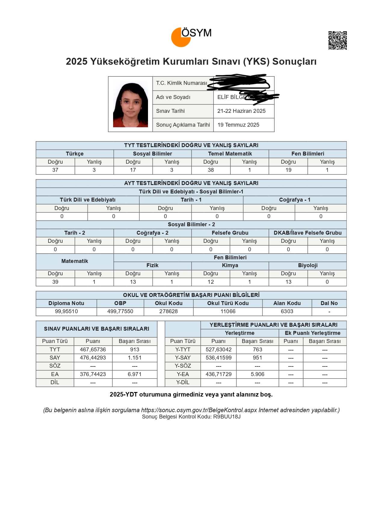 Merhabalar ben Elif Bilge. YKS 2025’te sayısal alandan 951. oldum. 9 ve 10 da hiç ders çalışmamıştım ve bütün eksiklerimi kalan 2 yıl içerisinde tamamladım. Ne kadar hocalarım hoşlanmasa da bu dönemde hem sosyalliğimi korudum hem de derslerimi güzel bir şekilde çalıştım. Özellikle 11. Sınıfta bir çalışma temposu oluşturup 12 de bunu devam ettirebilmem bu sınav sürecinde en büyük artım oldu