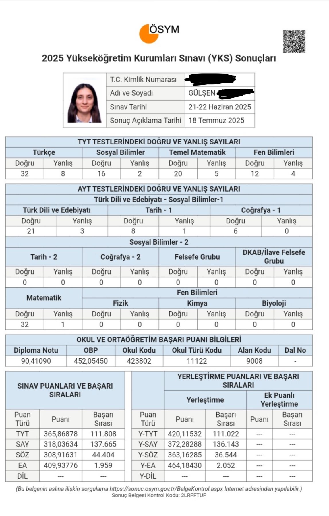 Merhabaa, ben Gülşen. YKS 2025’te EA alanında ham 1.959, yerleştirme 2.052 sıralama yaparak TOBB ETÜ İşletme bölümüne yerleştim. 9. ve 10. sınıfta çok sınav odaklı değildim; bu sürece asıl olarak 11. sınıfta başladım. 11. sınıftan itibaren eksiklerimi fark ederek onların üzerine gitmeye, kendimi geliştirmeye ve adım adım ilerlemeye çalıştım. Bu süreçte her şey hep iyi gitmedi; yeri geldi düştüm, yeri geldi çok iyi netlere ulaştım. Bu yolculuğa başladığımda 52 netle başlamıştım ve zamanla netlerim arttı. Sürecin sonunda ise bu sıralamaya eriştim. Bu süreçte en zorlandığım şeylerden biri motivasyonumu korumak ve süreci düzgün bir şekilde yönetebilmekti. Şimdi sizlere bu süreçteki deneyimlerimi, keşkelerimi ve iyikilerimi aktarmak istiyorum; çünkü sizin şu anda yaşadığınız bu zorlu süreci geçen sene ben de yaşıyordum. Yanınızda olduğumu, bu süreçte yalnız olmadığınızı hissettirmek ve size destek olmak için sabırsızlanıyorumm :)